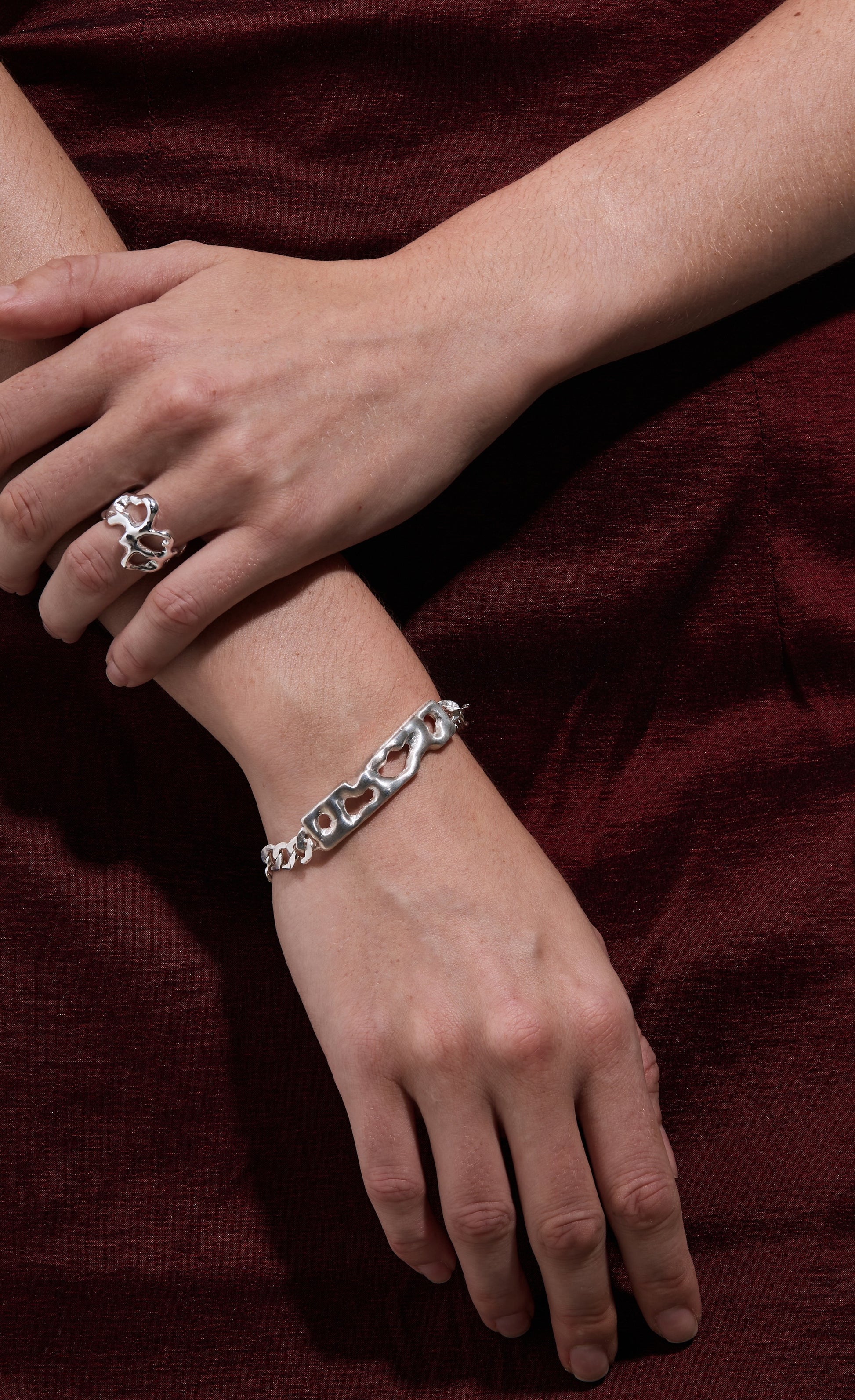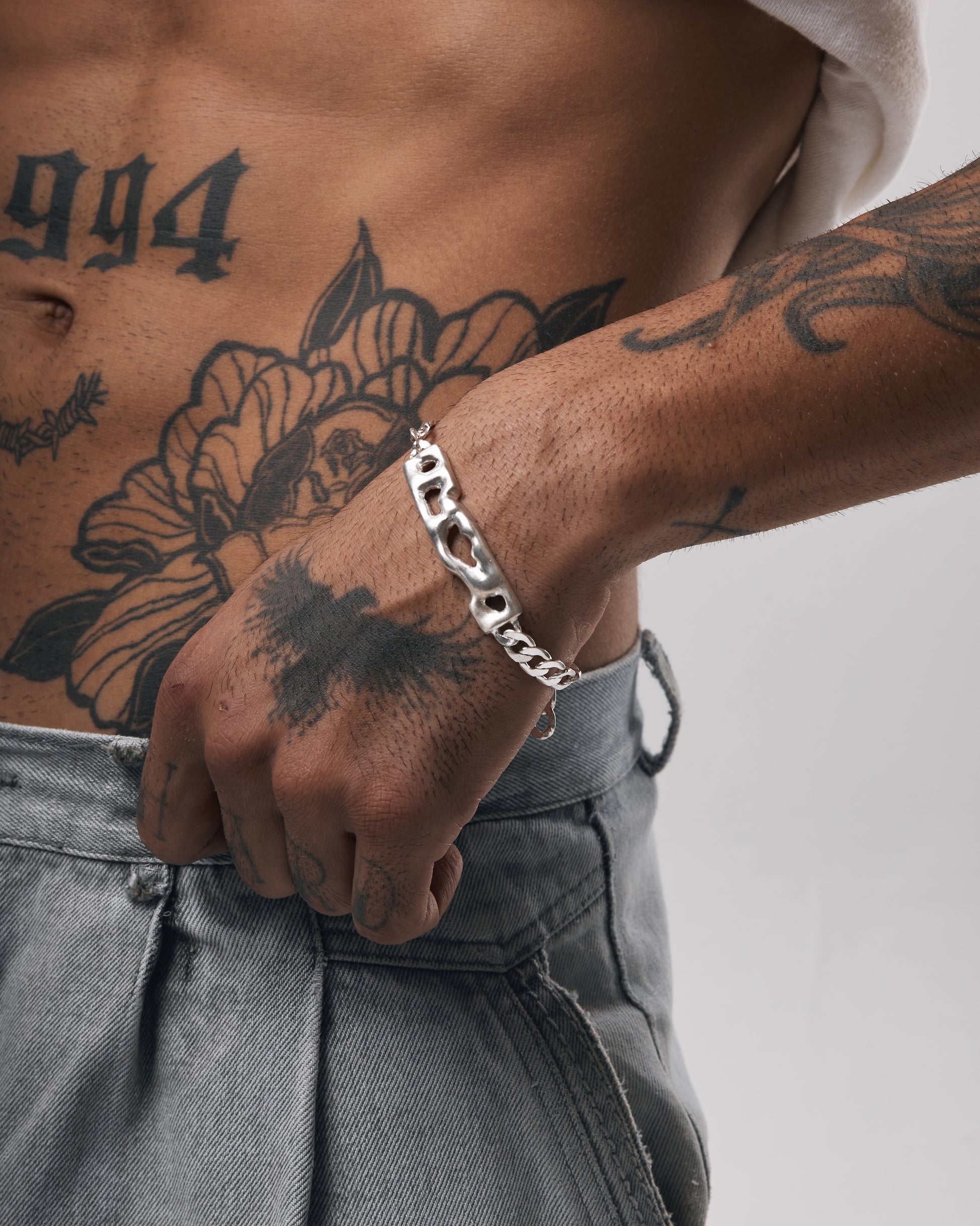 Handcrafted from Recycled 925 Silver, this bracelet features a hand carved silver bar inspired by water's ability to adapt and contour to any shape , seamlessly blending into a sterling silver plated bracelet. The wearer can adjust the size by clipping the hook on to any of the chain's links for a comfortable fit.